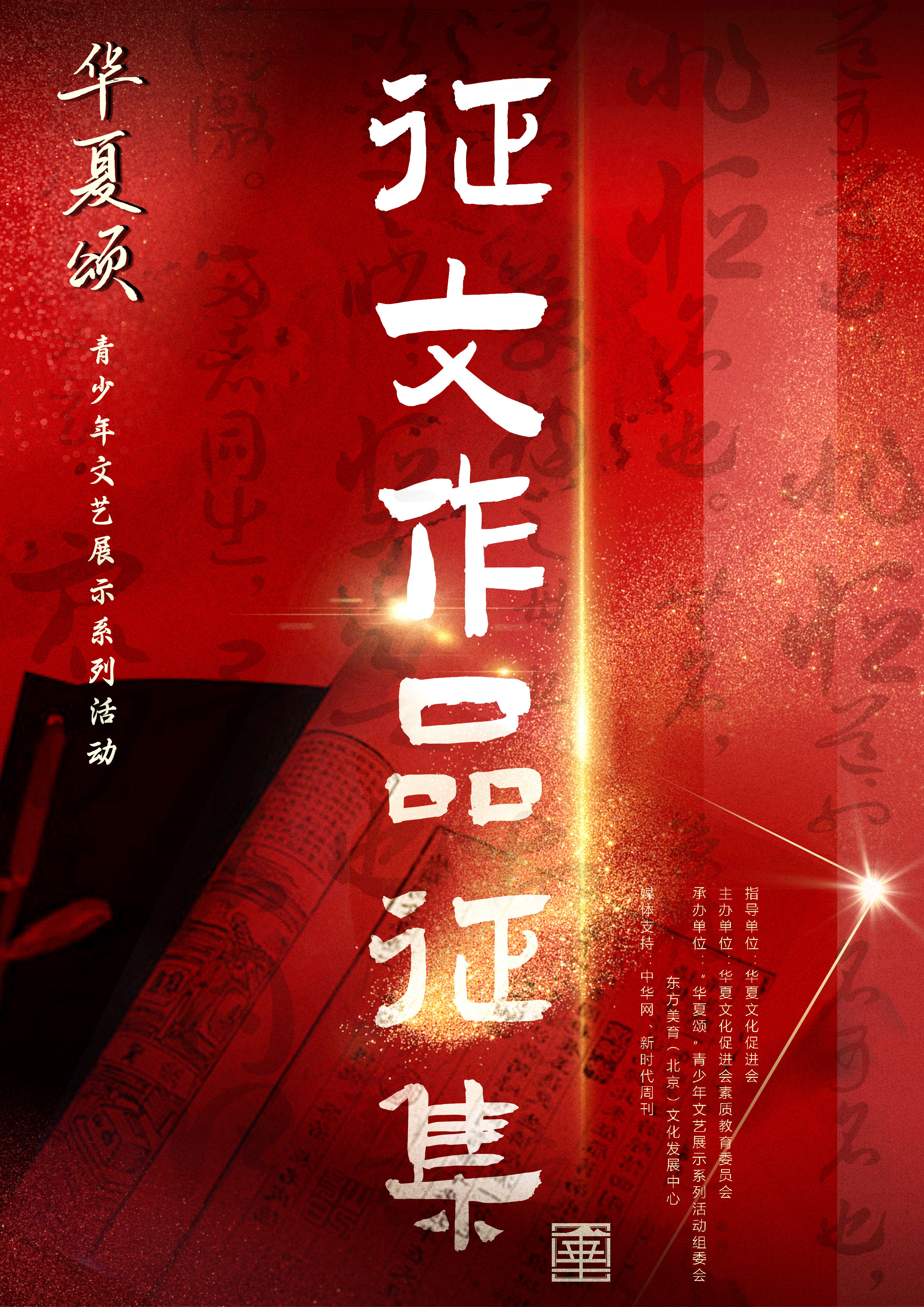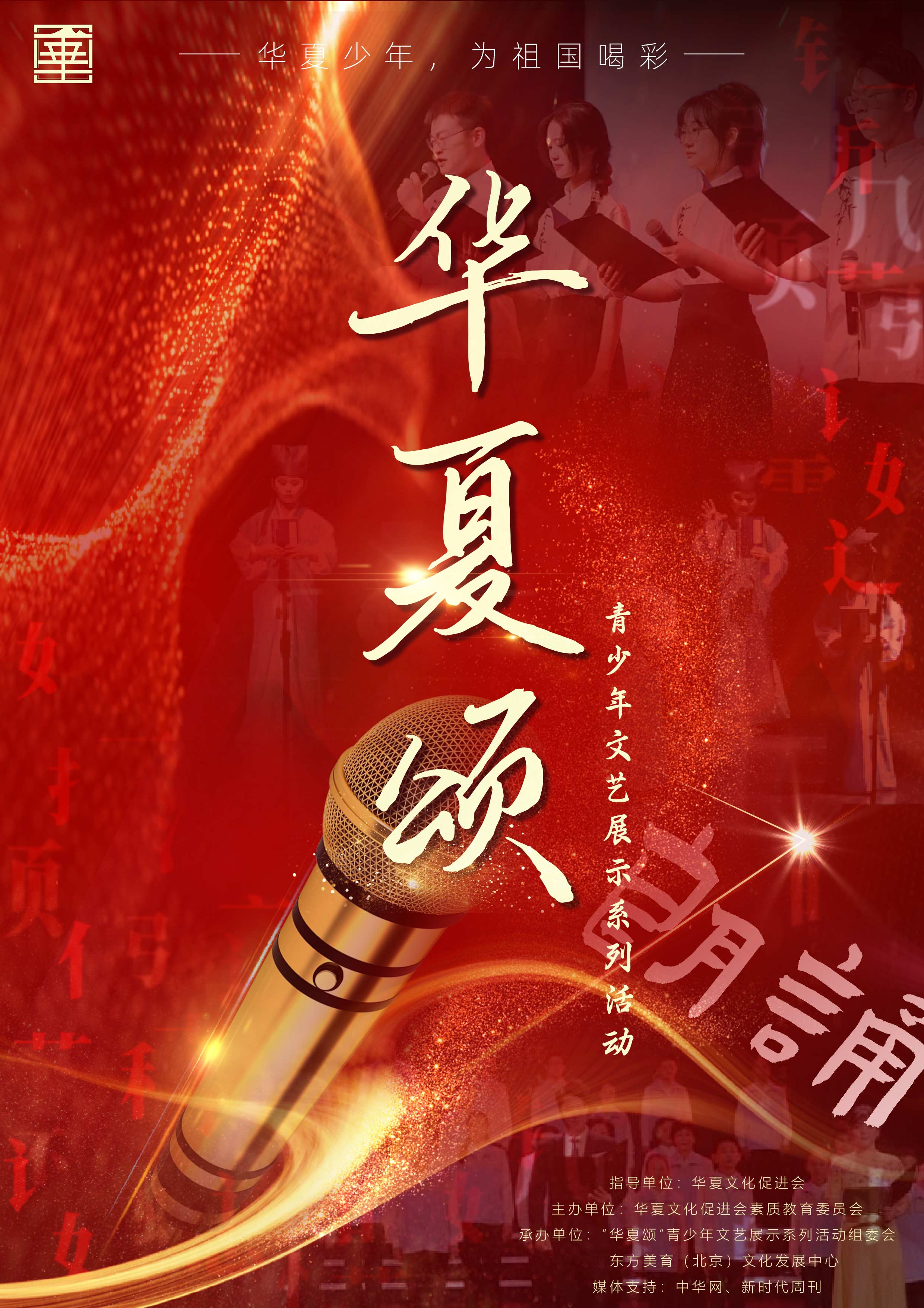 “华夏颂”青少年文艺展示系列活动章程 第一章 总则第一条 活动性质:“华夏颂”青少年文艺展示系列活动由华夏文化促进会素质教育委员会主办,华夏文化促进会支持。旨在为青少年搭建一个文化与艺术交流的平台,助力青少年提升素养、开阔视野,推动文化艺术的交流与融合。第二条 活动宗旨:以 “华夏少年,为祖国喝彩” 为精神内核,,全方位点燃青少年对祖国的热爱,深度激发他们的爱国情怀,全面提升其艺术审美、语言表达、知识储备、团队协作等综合素养,助力他们成长为有担当、有情怀的新时代青年。第三条 活动原则:1. 坚持…